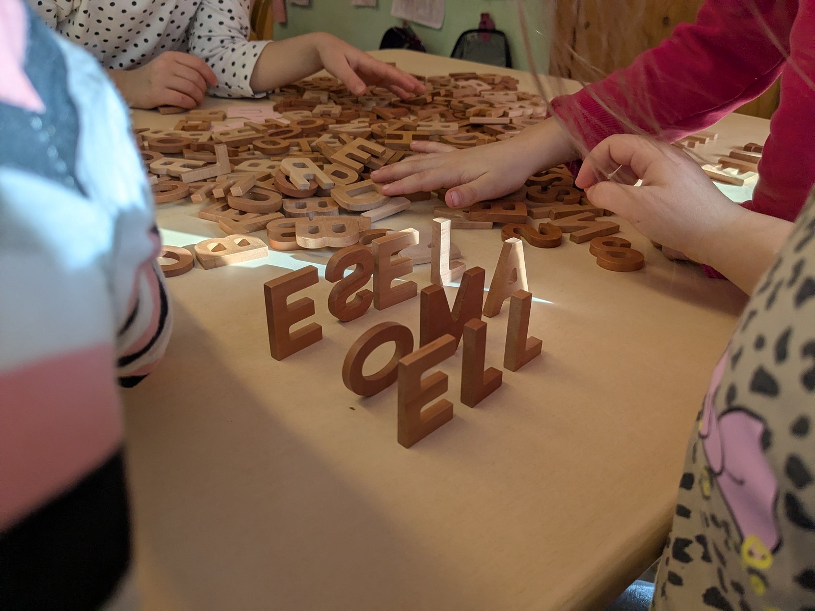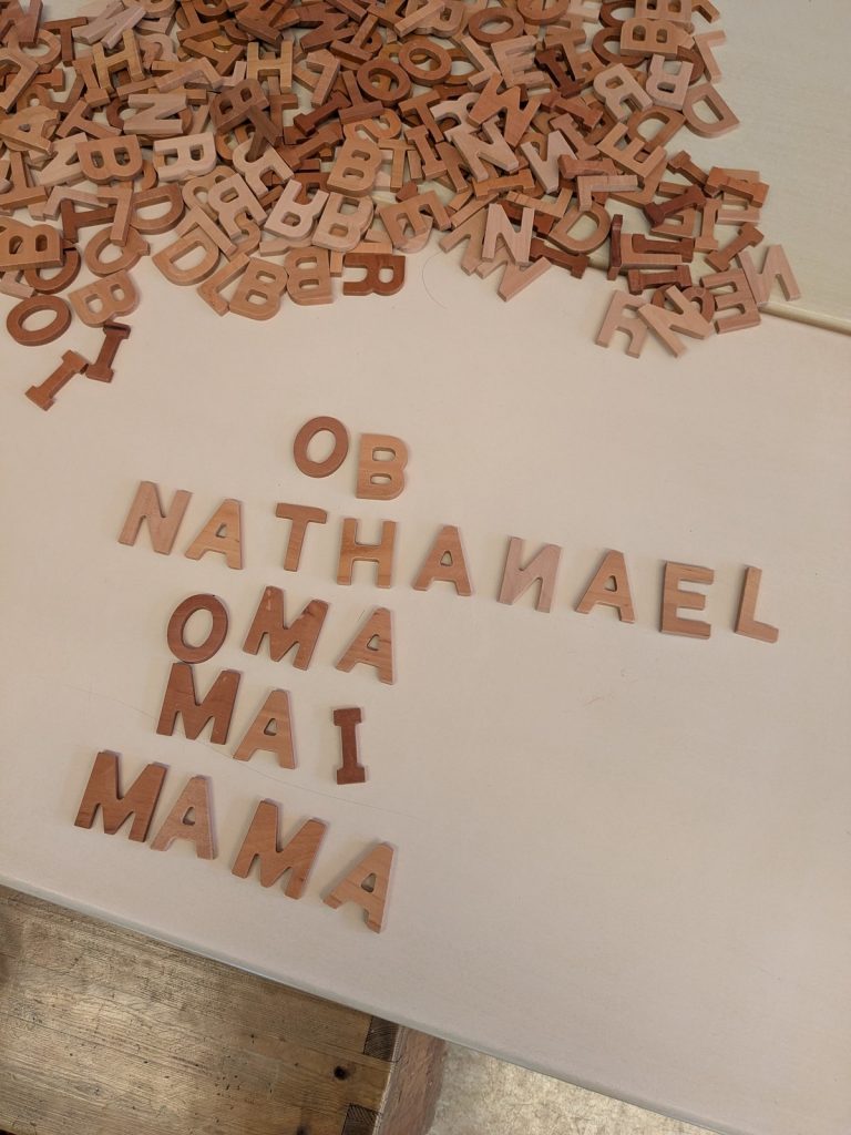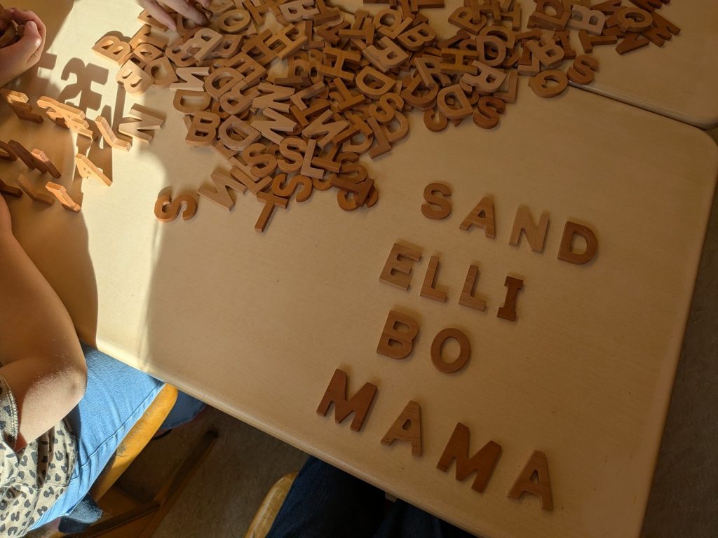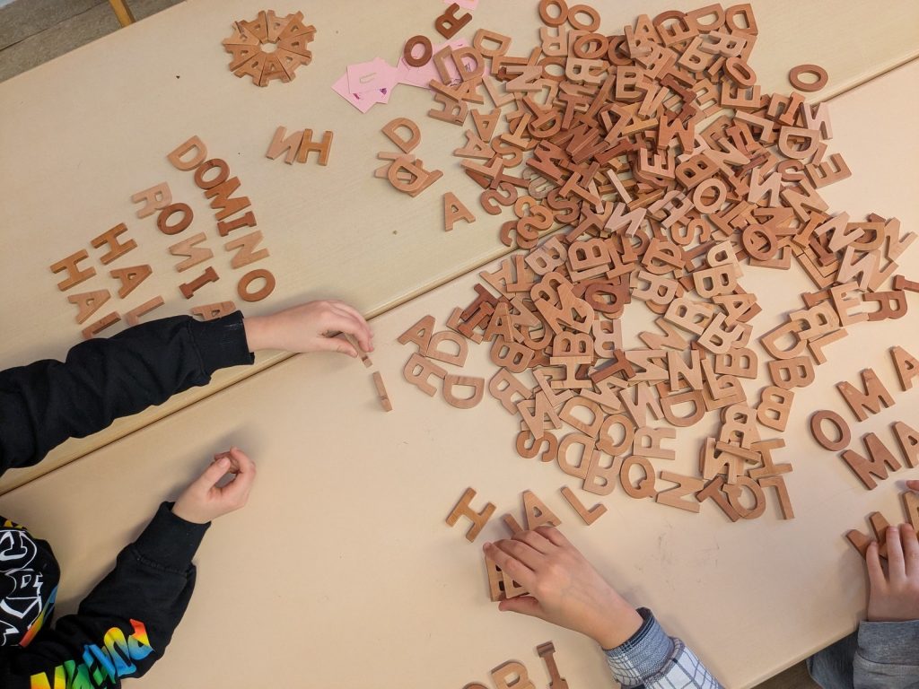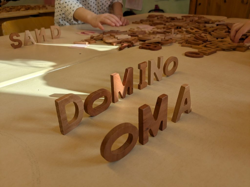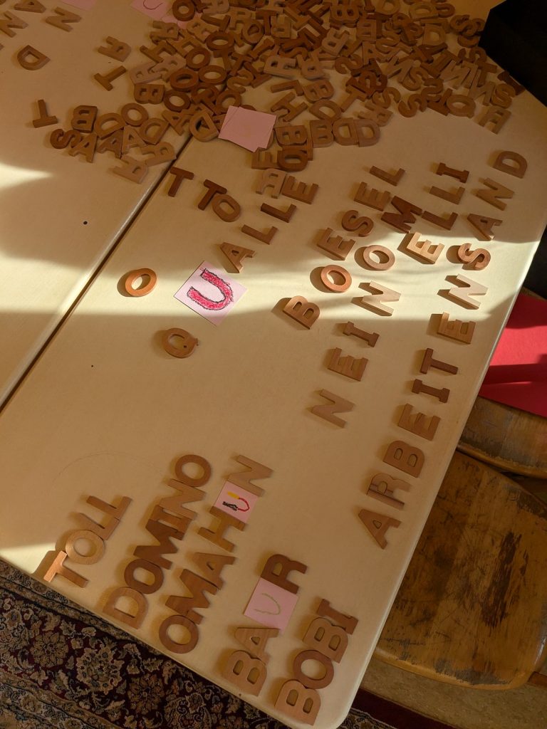 An unserer Schule lernen die Kinder intensiv jeden einzelnen Buchstaben kennen. Mit Kopf, Herz und Hand erfahren wir die Buchstaben und verknüpfen Geschichten, Emotionen und gefühlte Eindrücke mit jedem einzelnen. Am Freitag haben wir ausprobiert, welche Worte wir schon aus den bisher gelernten Buchstaben bilden können. Dafür haben wir unsere Holzbuchstaben verwendet…